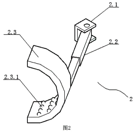 如圖2所示,所述定位裝置2包括U型連接組件2.1、可轉(zhuǎn)動(dòng)伸縮桿2.2、夾持弧形件2.3,所述U型連接組件2.1固定在所述測量導(dǎo)管1.2上,所述可轉(zhuǎn)動(dòng)伸縮桿2.2為長方形伸縮桿,所述可轉(zhuǎn)動(dòng)伸縮桿2.2的右端部位通過銷軸與所述U型連接組件2.1鉸接,所述夾持弧形件2.3固定在所述可轉(zhuǎn)動(dòng)伸縮桿2.2的左端面,所述夾持弧形件2.3上設(shè)有滾珠2.3.1,若干個(gè)所述滾珠2.3.1位于所述夾持弧形件2.3的內(nèi)側(cè)表面上,所述滾珠2.3.1可相對所述夾持弧形件2.3滾動(dòng)。