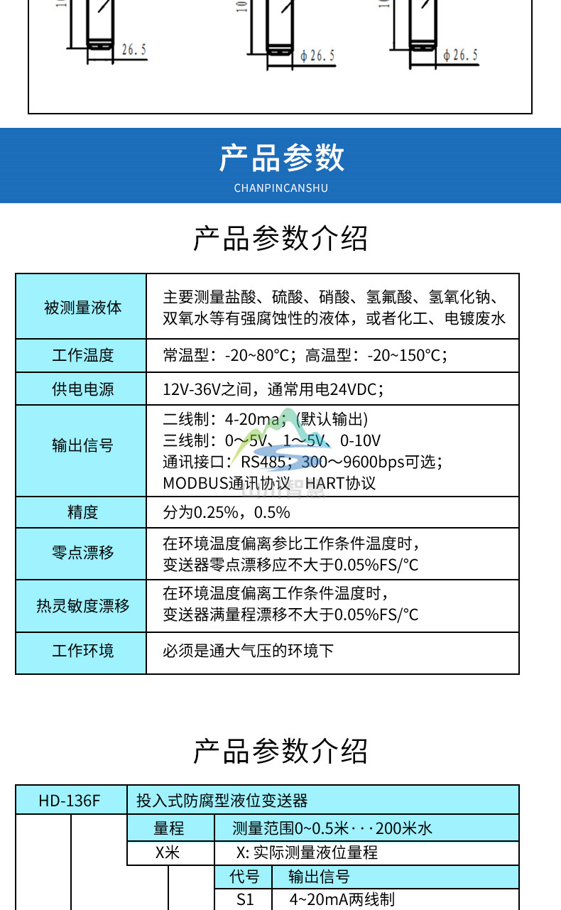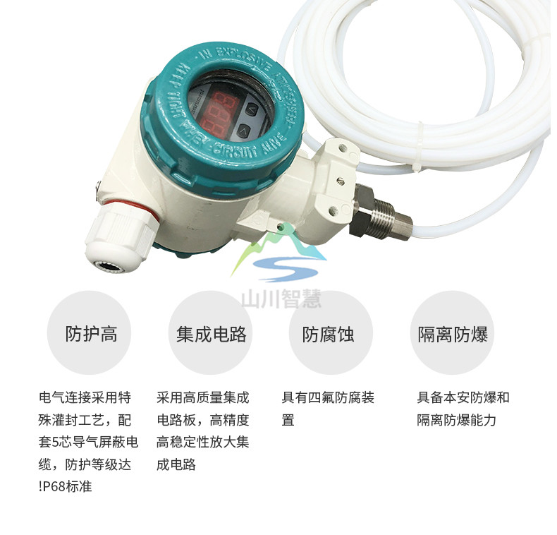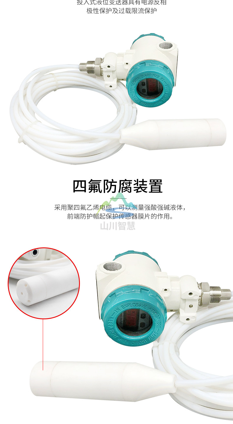 防腐投入式液位計的液位傳感器性能可靠。采用擴散硅芯體進口芯片,三道密封工藝,密封嚴謹可靠,特點壓力越強密封效果越好,使其在較深的液體中性能穩(wěn)定。電路采用信號隔離放大,截頻干擾設計(抗干擾能力強,防雷擊)過壓保護,限流保護,抗沖擊,防腐等設計。性能可靠,處于國內與國外**水平。