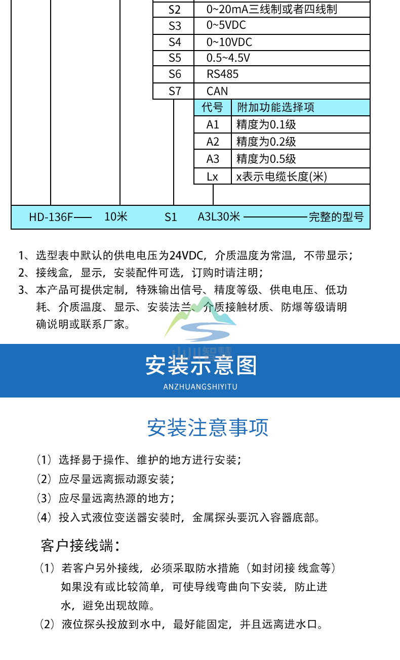 2、在測量流動性較大的介質時,為防止傳感器劇烈擺動,用戶可選用配重附件,以起到穩(wěn)定傳感器的作用,加配重時一定要要把配重物體放入容器底部,以免拉壞傳感導線。