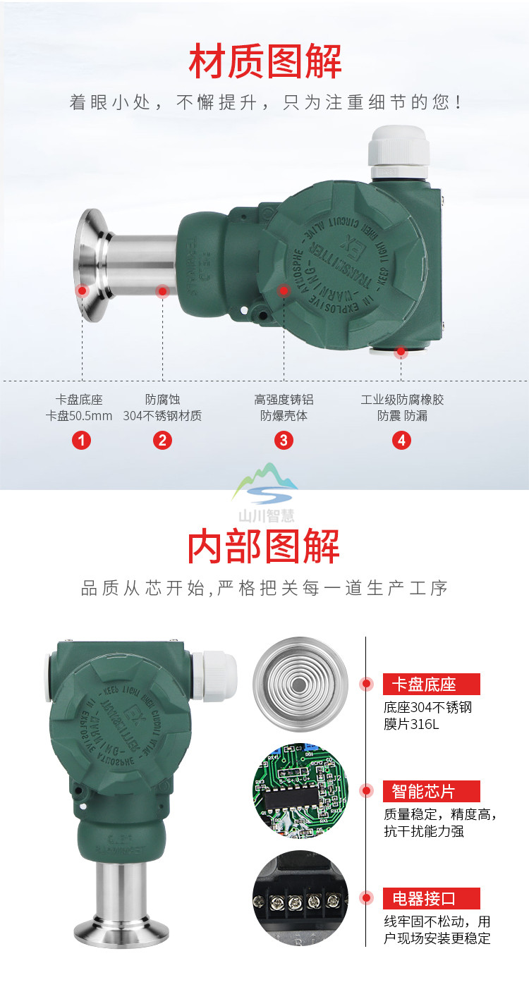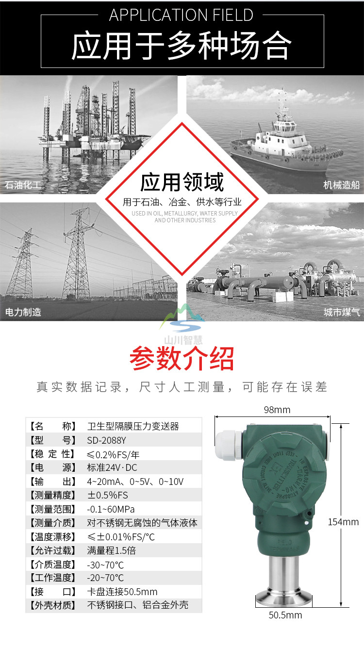 衛(wèi)生型隔膜壓力變送器,結(jié)構(gòu)緊湊、耐腐蝕,抗震動(dòng)、抗微粒沖擊、寬范圍溫度補(bǔ)償。全部采用316L不銹鋼材料,特別適用于醫(yī)療、食品行業(yè)有衛(wèi)生要求的,粘稠流體壓力和液位測(cè)量,解決了結(jié)垢,堵塞,清潔衛(wèi)生等問題?!ぁぁ?/p>