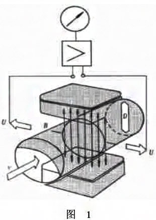 電磁流量計(jì)的基本原理是法拉第電磁感應(yīng)定律,運(yùn)動的導(dǎo)體在磁場中切割磁力線,在其兩端產(chǎn)生感應(yīng)電動勢。如圖1所示,在一內(nèi)徑為D,內(nèi)部磁場強(qiáng)度為B的非導(dǎo)磁性測量管內(nèi),液態(tài)的具有導(dǎo)電性被測介質(zhì)以ν的速度流動,則在與流動方向垂直的方向上產(chǎn)生與流量成比例的感應(yīng)電勢U,該電勢的大小如下