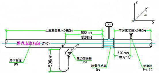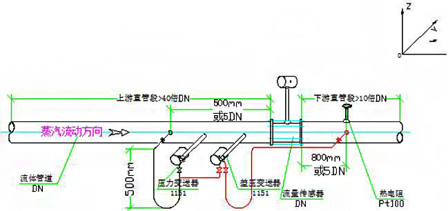 一般渦街流量傳感器要求安裝在與其相同管徑的直管段上,不同廠家前后直管段要求略有不同,但都是要求越長越好。如是測定質(zhì)量流量,通常增加溫度與壓力補(bǔ)償測定,其中取壓元件大部分要求在渦街傳感器前面,溫度測點布置在后面,如圖例1所示