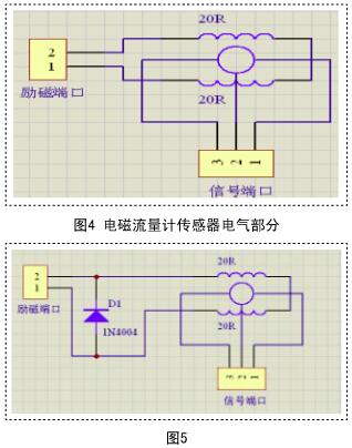 電磁流量計傳感器勵磁電流是產(chǎn)生電火花的危險源,電磁流量計要用于井下,首先得勵磁電路達(dá)到本質(zhì)安全要求。電磁流量計傳感器電氣部分由2個線圈組成,如圖4。