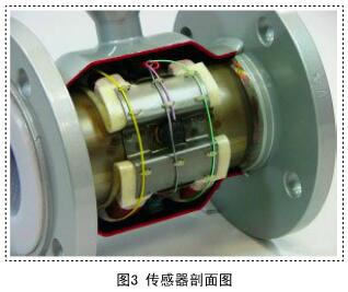 其中B、D、S為常量,流量與感應(yīng)電動(dòng)勢(shì)U成正比關(guān)系,因此,測(cè)得感應(yīng)電動(dòng)勢(shì)U,即可得到流體流量。由此可見(jiàn),電磁流量計(jì)正常運(yùn)行需要有穩(wěn)定的磁場(chǎng),而磁場(chǎng)正是靠傳感器線圈內(nèi)的勵(lì)磁電流來(lái)產(chǎn)生的。勵(lì)磁線圈如圖2所示。對(duì)線圈對(duì)稱安裝在傳感器正對(duì)的兩側(cè),以產(chǎn)生均勻的磁場(chǎng),傳感器剖面圖如圖3所示