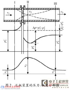 充滿管道的流體流經管道內的節(jié)流裝置,由于節(jié)流元件造成的流束局部收縮,使管中心流體流速發(fā)生變化,其靜壓力隨之變化。由于流體流經孔板時,產生局部渦流損耗和摩擦阻力損失,在流束充分恢復后,靜壓力不能恢復到原來的數值。節(jié)流元件前后的靜壓差大小與流量有關,流量愈大,流束的收縮和動、靜壓能的轉換也愈顯著,則產生的壓差也愈大。只要測得節(jié)流元件前后的靜壓差大小,即可確定流量,這就是節(jié)流裝置測量流量的基本原理,如圖2 所示。這種測量方法是以能量守恒定律和流動連續(xù)性方程為基礎的。