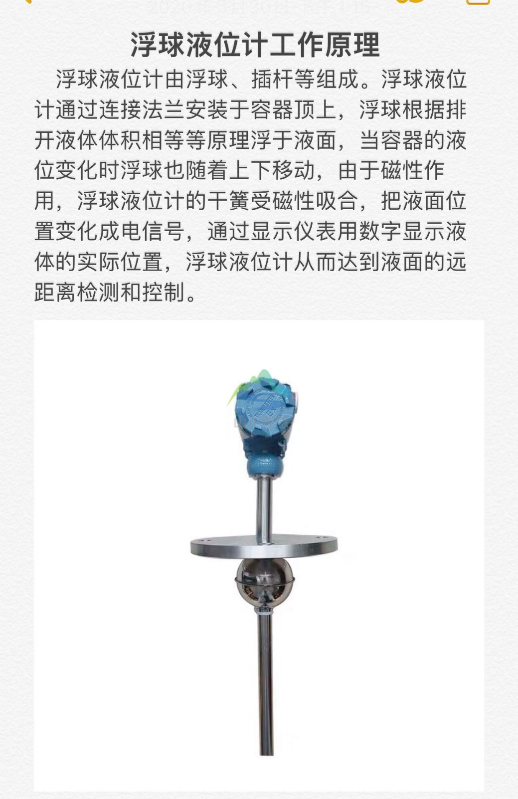 水位控制器由磁浮球、傳感器、變送器三部分組成。當(dāng)磁浮球隨液位變化,沿導(dǎo)管而上下浮動(dòng),浮球內(nèi)的磁鋼吸合傳感器內(nèi)相應(yīng)位置上的干簧管,使傳感器的總電阻(或電壓)發(fā)生變化,再由變送器將變化后的電阻(或電···