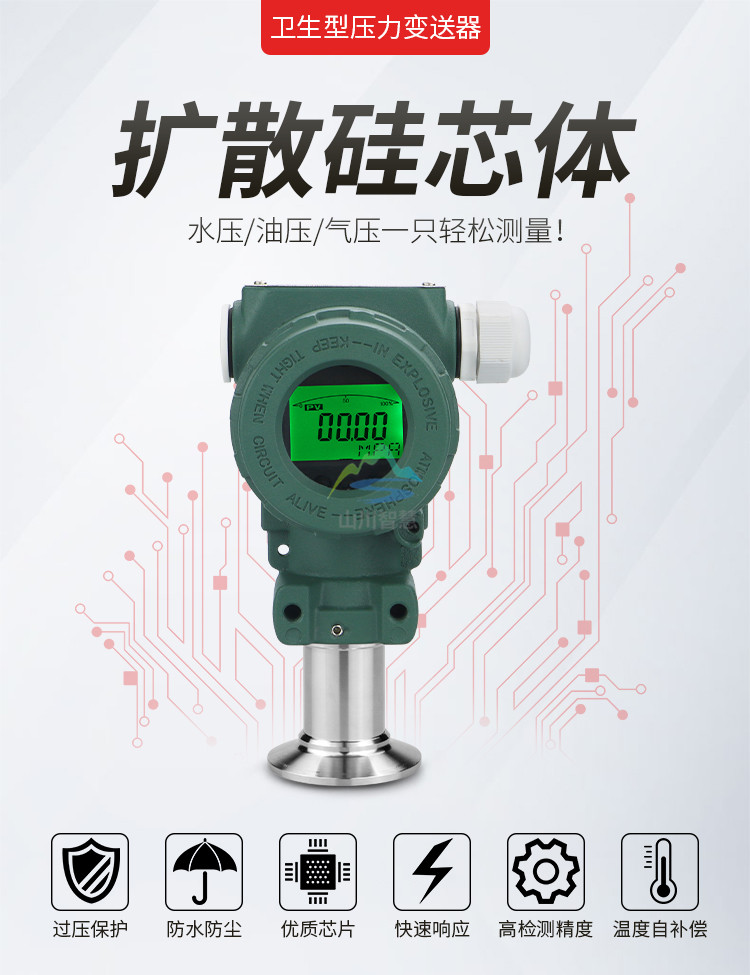 衛(wèi)生型隔膜壓力變送器,結(jié)構(gòu)緊湊、耐腐蝕,抗震動(dòng)、抗微粒沖擊、寬范圍溫度補(bǔ)償。全部采用316L不銹鋼材料,特別適用于醫(yī)療、食品行業(yè)有衛(wèi)生要求的,粘稠流體壓力和液位測(cè)量,解決了結(jié)垢,堵塞,清潔衛(wèi)生等問題。