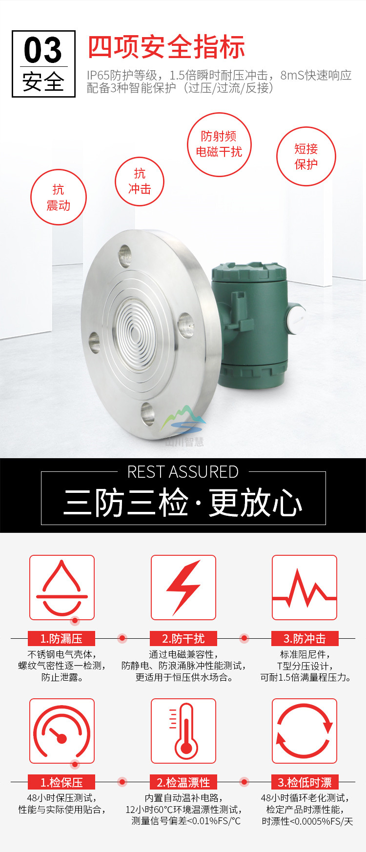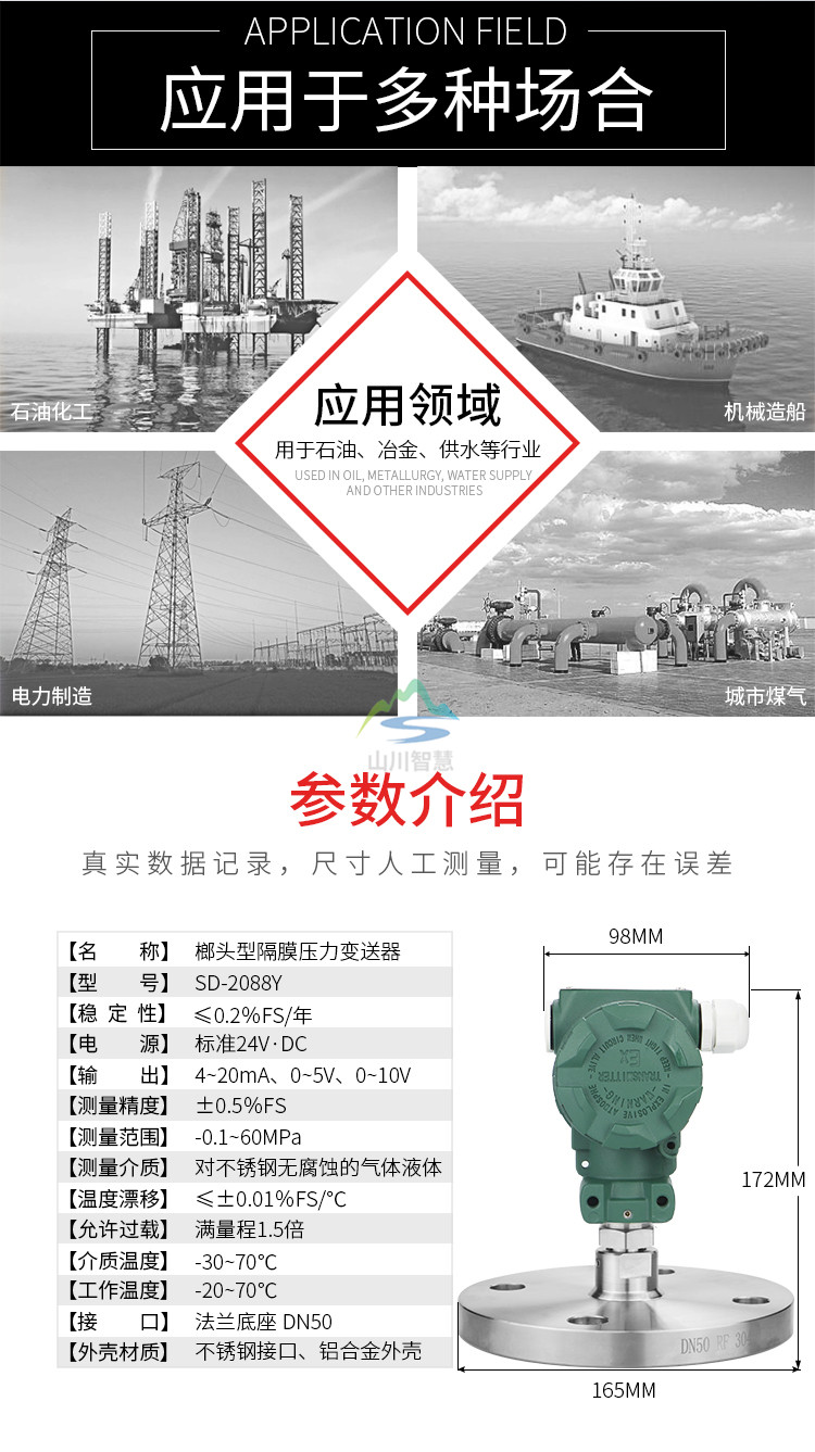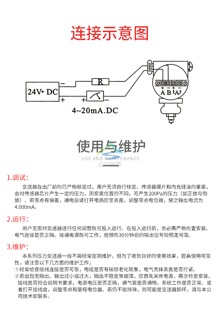 測(cè)量范圍:電子線路:-40-+85℃敏感元件(充硅油):-40 - +104℃(充惰性油);0 - +71℃
