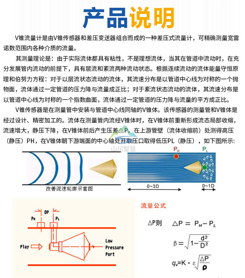 工作原理: 是一種差壓流量儀表,迄今為止以差壓原理設(shè)計(jì)的流量儀表已經(jīng)有一百多年的應(yīng)用歷史了。差壓原理是基于密封管道中的能量轉(zhuǎn)換原理,也就是說對穩(wěn)定流體,流量與管道中介質(zhì)流速的平方根成正比。當(dāng)介質(zhì)接近錐體時(shí),其壓力為P1,在介質(zhì)通過錐體的截流區(qū)時(shí),速度增大,壓力降低為都通過錐形流量計(jì)的取壓口引到差壓變送器上,當(dāng)流速發(fā)生變化時(shí),錐形流量計(jì)的兩個(gè)取壓口之間的差壓值會(huì)增大或縮小。 錐流量計(jì)在進(jìn)行流量計(jì)算時(shí)所采用的計(jì)算公式同其他差壓流量儀表相同,但其截流元件的獨(dú)特設(shè)計(jì),迫使管道中心的介質(zhì)繞著錐體流動(dòng),與其他差壓流量計(jì)相比這樣有很多優(yōu)點(diǎn)。我們可以借助理想狀態(tài)流速曲線分布圖來理解錐形流量計(jì)的性能。管道中的流體沒有受到任何干擾和阻礙,即是我們所說的理想流態(tài),他的流速分布均勻,靠近管壁的流速幾乎為零,管道中心的流速達(dá)到***,靠近管壁的流速幾乎為零,是由于管壁對介質(zhì)的摩擦力造成的。由于錐體懸掛在管線中心,他直接同流體的高速區(qū)接觸,迫使高速區(qū)的流體同近管壁低速區(qū)的流體相混合從而使流速均勻化。所以即使流速很低,錐形流量計(jì)仍能使流體與管道中心的***高流速連續(xù)作用產(chǎn)生正確差壓。