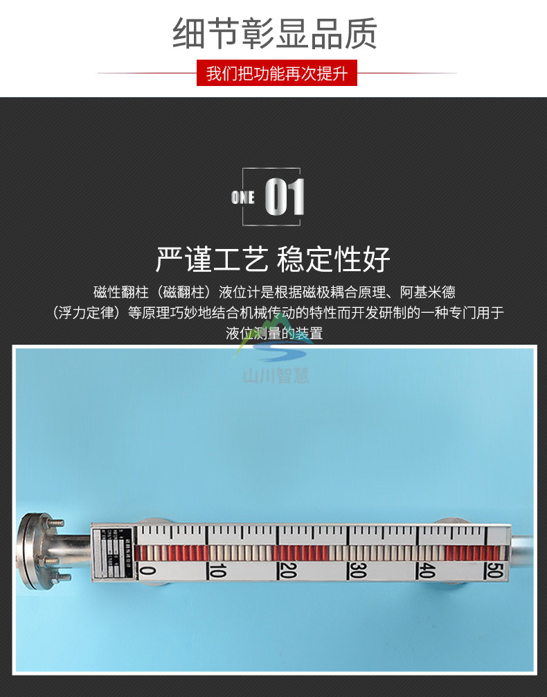 根據(jù)浮力原理,浮子在測量管內(nèi)隨液位的升降而上、下移動,浮子內(nèi)的**磁鋼通過耦合作用,驅動紅、白色翻柱翻轉180°,液位上升時翻柱由白色轉為紅色,下降時由紅色轉為白色,從而實現(xiàn)液位指示。