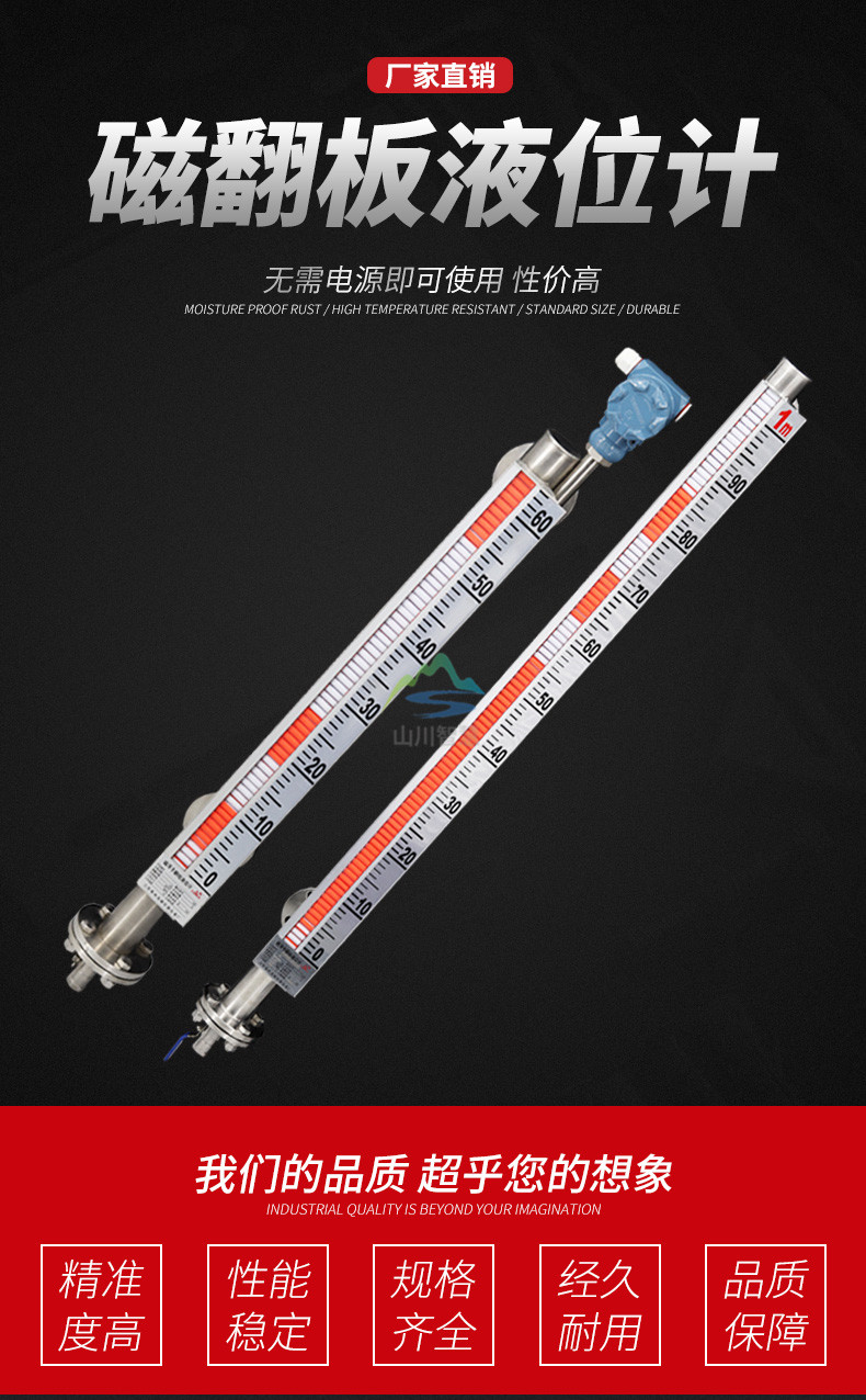 本公司生產(chǎn)的磁翻板液位計應(yīng)用液位計根據(jù)浮力原理和磁性耦合作用研制而成。當被測容器中的液位升降時,液位計主導管中的浮子也隨之升降,浮子內(nèi)的***磁鋼通過磁耦合傳遞到現(xiàn)場指示器,驅(qū)動紅、白翻柱翻轉(zhuǎn)180度,當液位上升時,翻柱由白色轉(zhuǎn)為紅色,當液位下降時,翻柱由紅色轉(zhuǎn)為白色,指示器的紅、白界位處為容器內(nèi)介質(zhì)液位的實際高度,從而實現(xiàn)液位的指示。